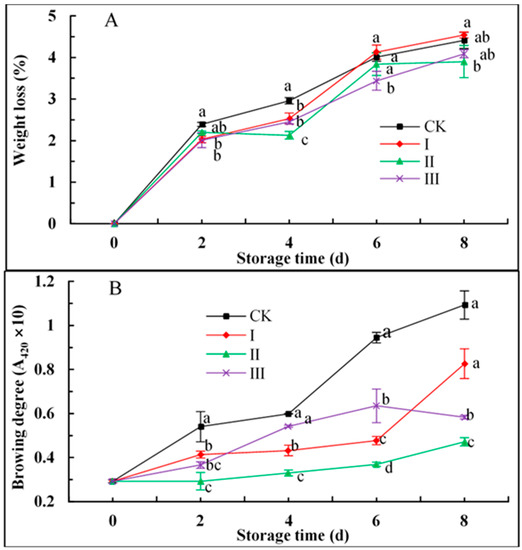 Weight loss (A) and browning degree (B) in F. velutipes stored at 6 °C for the indicated periods following treatment with 10 (group I), 50 (group II), or 250 (group III) µL L−1 IAITC, or with distilled water (group CK). Error bars indicate SD calculated from three replicate experiments, and differing letters indicate significant (p < 0.05) differences between groups for a given storage period.