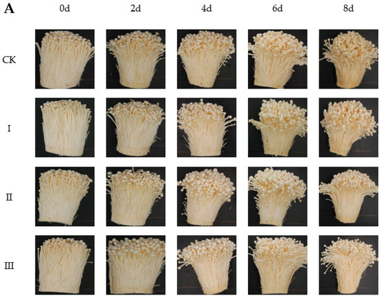 As storage continued, mushrooms displayed increased degrees of browning, stipe elongation, cap opening, and wilting (Figure 2A). On day 8, CK had notably stronger browning, longer stipes, reduced firmness, and more diffused fruiting bodies compared to day 0, which were milder in the IAITC-treated groups. Group II treated with 50 µL L−1 maintained the best quality, including white color and neat appearance.