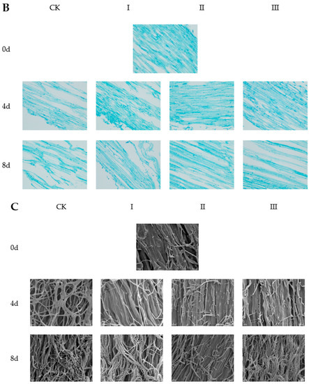 Stipe tissue microstructure reflects changes in external appearance as described above. Examination by optical microscopy showed that stipe tissues became sparser generally as storage time increased, but it was denser in II and III than in CK and I (Figure 2B). More detailed information from SEM (Figure 2C) revealed that stipe tissue was plump and dense on day 0. The tissue began to loosen (day 4) and collapse (day 8) in CK, while remaining relatively intact in II and III.