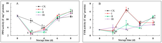 During storage days 1–4, PPO activity was significantly higher for CK than that for the IAITC-treated groups (Figure 3A). The activities increased for all groups during days 4–8 and did not differ significantly among them at day 8 (p > 0.05).