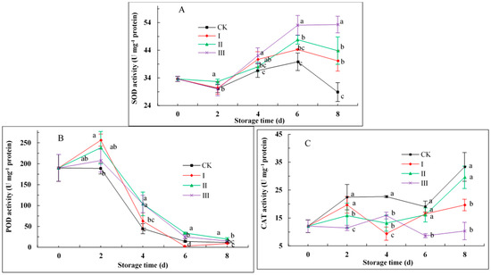 CAT activity in groups treated with IAITC was lower than CK throughout the storage period (Figure 4C). The activity in group III was significantly lower than that in the other groups, while II and CK were very close during days 6 to 8.