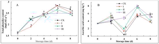 Ascorbic acid content varied widely during storage for all groups (Figure 5B). Initial (day 0) content was 3.36 mg kg−1, and the highest values were observed on day 6 for III (7.98 mg kg−1) and II (7.63 mg kg−1). Ascorbic acid in CK was lower than IAITC-treated groups during the first 6 days. The content in group III was significantly higher than others at day 4. Content declined sharply in the three IAITC-treated groups from day 6 to day 8, while it increased slightly in CK.