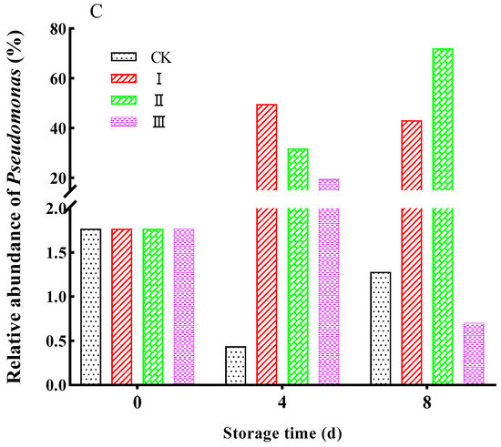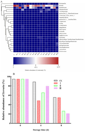 In order to clarify the changes in the relative abundance of bacterial genera, samples from day 0, 4, and 8 were selected for analysis of the bacterial community structure (Figure 7A). A heat map revealed that there were two main bacteria on the surface of F. velutipes. On day 0, the predominant genus was Serratia (relative abundance 94.77%). Along with the extension in storage time, relative abundance of Serratia declined (Figure 7B). On the other hand, Pseudomonas grew rapidly, and became the predominant bacterial community member on day 4 in I, and on day 8 in II (Figure 7C).