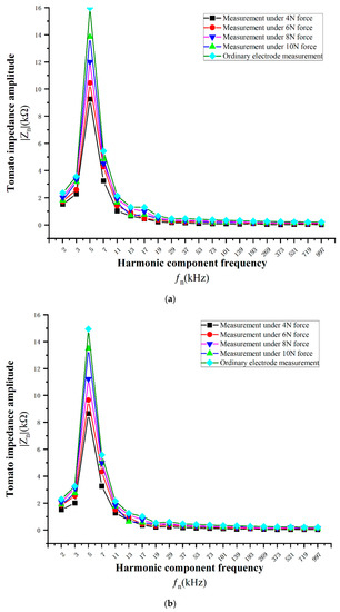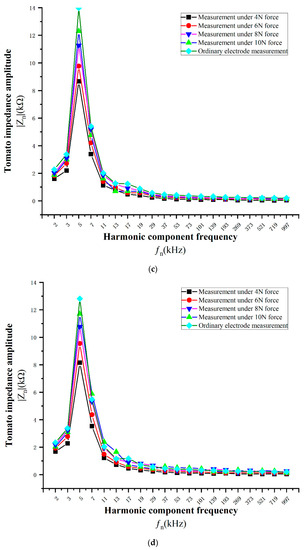 - When collecting tomatoes under a force of more than 10 N, the relative error between the electrical parameters obtained from FSR and the values obtained from ordinary electrode plates was within 10%, and within the frequency range of 2–13 kHz, the relative error of impedance values was within 5%.