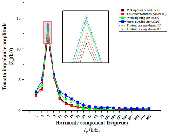 - When tomatoes were placed for a long time, the impedance value corresponding to 5 kHz significantly increased as their maturity deepened. The impedance value in the pink phase was the highest, approaching 30. When tomatoes were placed for a short time, a series of chemical changes occurred within the tomato cells, which could cause fluctuations in the electrical parameters of the tomato over time.