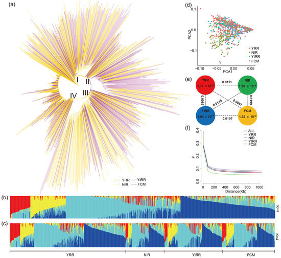 The population diversity of geographical distribution. (a) The neighbor-joining phylogenetic tree, which was divided into I, II, III and IV subgroups. (b) Population structure results for all samples (k = 4). (c) Population structure results for different geographical distribution (k = 4). (d) Principal component analysis plot for all accessions. (e) θπ and FST in different geographical distribution. (f) Linkage disequilibrium decay of different geographical distribution.