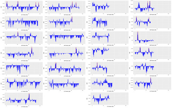 Here, 890 public upland cotton accessions were collected and downloaded from the National Center for Biotechnology Information (NCBI), which included 714 improved upland cotton cultivars from China and 176 improved upland cotton cultivars from the USA and other countries (FCM). Furthermore, the 714 improved upland cotton cultivars in China are divided into four groups by geographical distribution, 195 upland cotton cultivars from the Yangtze River region (YtRR), 390 upland cotton cultivars from the Yellow River region (YRR), 118 upland cotton cultivars from the northwestern inland region (NIR) and 11 upland cotton cultivars from other regions. A total of 12.84 Tb of raw genomic sequencing data was obtained, with an average sequencing depth of 6.3 ×(Table S1). First, the raw data were converted to fastq format with sratoolkit.2.4.3 software (NCBI, USA) [31]. Low-quality sequences were filtered with Trimmomatic (v.0.32) software (Jülich, Germany) [32]. Then, the filtered sequences were aligned against reference genome TM-1 [33] with BWA-MEM (v0.7.10-r789) software (Cambridge, UK) [34], and the duplicated mapping reads were filtered with Picard programme (http://broadinstitute.github.io/picard/, accessed on 26 February 2022). GATK (v4.0.1, MA, USA) [35] and SAMtools/bcftools (Cambridge, UK,) [36,37] were used for genotyping, respectively, as described by Shen et al. [23]. To further obtain high confidence variants, only variants on the chromosome shared by GATK [35] and SAMtools/bcftools were retained [36,37], and the variants on the scaffold and the minimum allele frequency less than 5 were filtered. Finally, 1,427,171 SNPs for all, 1,347,173 SNPs for YRR, 1,370,684 SNPs for NIR, 1,302,014 SNPs for YtRR and 1,250,515 SNPs for FCM, were obtained, respectively. The number of common SNP was 1,117,112. The software Beagle (v5.0, Seattle, Washington, DC, USA) [38] with a hidden Markov model was used for genotype phasing.