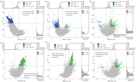 Genome−wide distribution of genomic regions with selective sweep signals of different geographical distribution. (a) Distribution of θπ ratios and FST values between YRR and NIR. (b) Distribution of θπ ratios and FST values between YRR and YtRR. (c) Distribution of θπ ratios and FST values between YRR and FCM. (d) Distribution of θπ ratios and FST values between NIR and YtRR. (e) Distribution of θπ ratios and FST values between NIR and FCM. (f) Distribution of θπ ratios and FST values between YtRR and FCM.