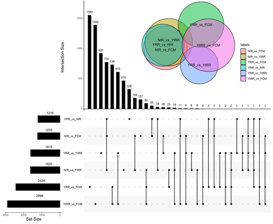 In order to estimate the potential pattern of introgression among NIR, YRR, YTRR and FCM, the rIBD statistic was used to infer introgression regions. Here, we found that a total of 42.73 Mb and 76 genomic regions containing 1470 protein−coding genes exhibited introgression signals that were introgressed from NIR to YRR (Figure 2 and Table S2). Noticeably, several large regions (>3 Mb) on chromosomes A10 and D06 exhibit very strong introgression signals (Figure 2). We found 462.49 Mb and 301 genomic intervals, containing 12,013 protein-coding genes exhibited introgression signals that were introgressed from YtRR to YRR (Figure S3 and Table S2). We obtained 25.42 Mb and 25 genomic intervals, containing 514 protein-coding genes that were introgressed from FCM to YRR (Figure S4 and Table S2). There were 45.91 Mb and 58 genomic intervals, containing 2888 protein-coding genes, introgressed from YtRR to NIR (Figure S5 and Table S2). No significant introgression signal was found between FCM and NIR (Figure S6 and Table S2). We obtained 88.29 Mb and 118 genomic regions, containing 2105 protein-coding genes, that were introgressed from FCM to YtRR (Figure S7 and Table S2). Genome-wide introgression pattern analysis showed that the introgression pattern was different among different geographical distributions.