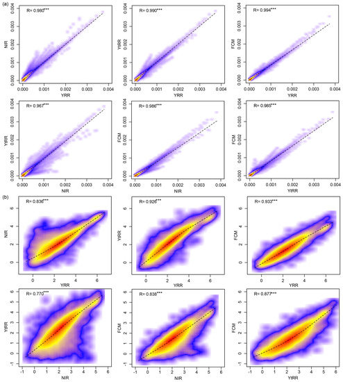 Distribution and pairwise correlation of nucleotide diversity (a) and Tajima’s D (b) of geographic sources. The red−yellow−blue color gradient means decreased density in the graph. *** means p-value ≤ 2.2 × 10−16.