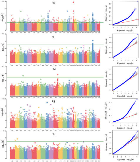 The results of genome-wide association study for fiber trait. Manhattan plots and quantile-quantile (Q-Q) plot for FE (a), FL (b), FM (c), FS (d) and FU (e).