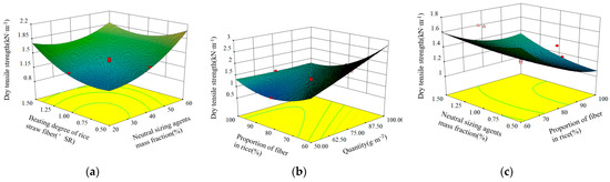 Response surface plot of factors affecting dry tensile strength index: (a) Influence of rice straw fiber and neutral sizing agents mass fraction on dry tensile strength index; (b) influence of quantity and proportion of fiber in rice on the dry tensile index. (c) Influence of fiber in rice and neutral sizing agents mass fraction on dry tensile strength index. In the figure, red is the high value area, blue is the low value area, and green is the centered value area.