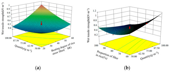 Figure 3. Response surface plot of factors affecting wet tensile strength index: (a) Influence of rice straw fiber and quantity on wet tensile strength index; (b) influence of quantity and proportion of fiber in rice on wet tensile strength index. In the figure, red is the high value area, blue is the low value area, and green is the centered value area.