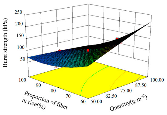 Influence of quantity and proportion of fiber in rice on burst strength index. In the figure, red is the high value area, blue is the low value area, and green is the centered value area.