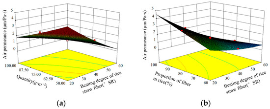 As shown in Figure 6a, when the quantity was 75 g/m2, the neutral sizing agents mass fraction was 1.0%, and the wet strength agent mass fraction was 1.4%, the effects of beating degree of rice straw fiber and quantity on air permeance of the straw fiber-based plant fiber seedling pot material were studied. The beating degree of rice straw fiber and quantity were negatively correlated with air permeance. As can be seen from Figure 6a, the effect of the beating degree of the rice straw fiber on wet tensile strength was greater than the quantity. In the test factor level range, the range of air permeance varied from 0.73 to 2.87 μm/Pa·s with the change in beating degree of the rice straw fiber and quantity. The maximum value achieved for the beating degree of rice straw fiber was 20°SR and the quantity was 50 g/m2.