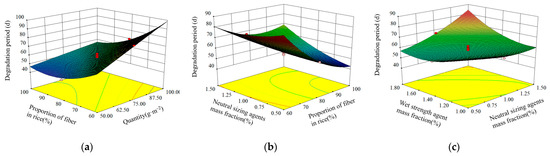 Effects of factors on degradation period. Response surface plot of factors affecting degradation period index: (a) Influence of quantity and rice straw fiber proportion on degradation period index; (b) influence of rice straw fiber proportion and neutral sizing agent mass fraction on degradation period index. (c) Influence of neutral sizing agent mass fraction and wet strength agent mass fraction on degradation period index. In the figure, red is the high value area, blue is the low value area, and green is the centered value area.