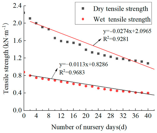 Variation of dry and wet tensile strength of seedling pot with the growing-seedling period.