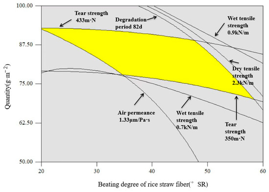 Optimization analysis was performed to meet the technical requirements of agronomic and mechanical transplanting, i.e., a dry tensile strength ≥ 1.8 kN·m−1, wet tensile strength ≥ 0.7 kN·m−1, burst strength ≥ 140 kPa, tear strength ≥ 350 m·N, air permeance ≤ 1.33 μm/Pa·s, and degradation period ≥ 60 d [26]. During the transplanting period, a material dry tensile strength ≥ 1 kN·m−1 and a wet tensile strength of ≥ 0.4 kN·m−1 were required while reducing the material manufacturing costs and reducing the energy consumption; furthermore, the constraints were set as follows: beating degree of rice straw fiber 20–60°SR, quantity 50–100 g/m2, proportion of fiber in rice 60–100%, neutral sizing agents mass fraction 0.5–1.5%, and a wet strength agent mass fraction 1.0–1.8%. The optimization analysis results are shown in Figure 9.