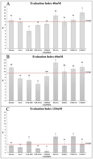 Evaluation index (EI) of nine potato clones at each salt concentration. EI was calculated for each salt concentration according to the formula: EI = Σ STIx, where x is one of the 12 phenotypic parameters evaluated (see Section 2). The red line indicates the average value of all clones. Data were analyzed by two-way analysis of variance following Duncan’s test. Error bars with different letters represent a statistical difference (p < 0.05, Duncan’s test).