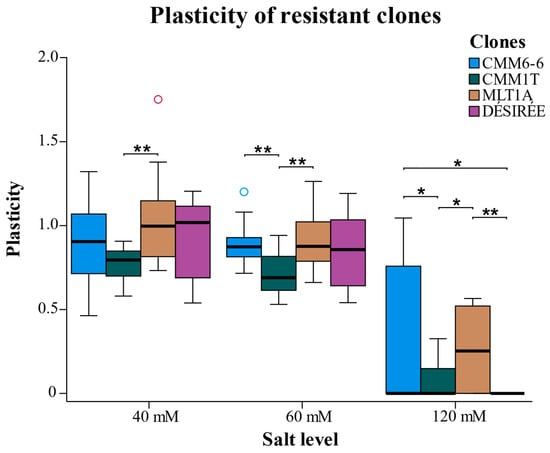 BoxPlots of salinity-resistant clones. BoxPlots shows the levels of plasticity of three selected tolerant clones and the control Désirée at each salt concentration. Bold asterisks indicate the significant differences between clones determined by the Student’s t-test (* p < 0.05, ** p < 0.01). Purple and blue circles represent outliers.