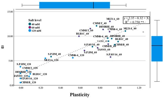 Scatter plot showing the correlation between evaluation index (EI) and plasticity. The different salt concentrations are identified by different colors. Data were analyzed by linear regression; the coefficient of determination R2 shows the correlation between EI and plasticity. Bold asterisks indicate significant differences (** p < 0.01). Blue bars provide a summary of the variability of dataset values. They show the median, the upper and lower quartiles, the minimum, and the maximum values.