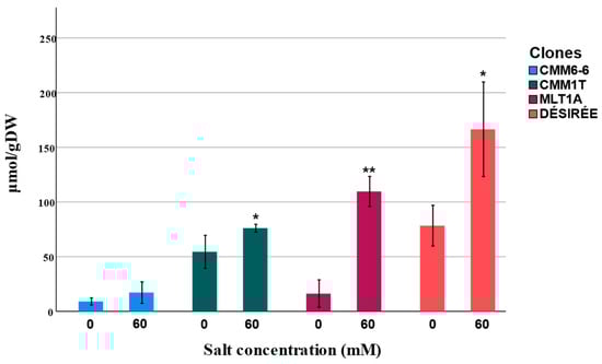 Proline content of three selected tolerant clones and the control Désirée at 0 mM NaCl and 60 mM NaCl. Bars represent the standard error, while bold asterisks indicate the significant differences between clones determined by the Student’s t-test (* p < 0.05, ** p < 0.01).