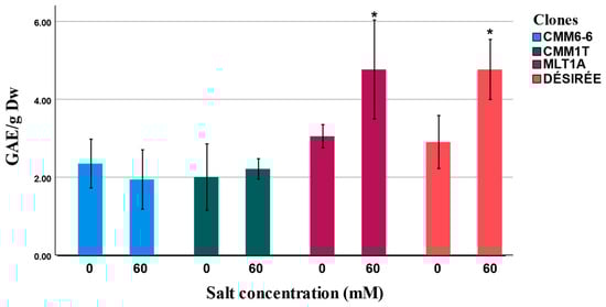 TPC (total phenol content) of three selected tolerant clones and the control Désirée at 0 and 60 mM NaCl. Bars represent the standard error, while bold asterisks indicate the significant differences between clones determined by the Student’s t-test (* p < 0.05). GAE (Gallic acid equivalents).