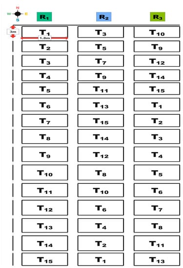 Layout of an experiment (R—replication; T—treatment; T1—RDFs + FYM (Control); T2—NP + VC (75% + 2.5 t/ha); T3—NP + VC (50% + 2.5 t/ha); T4—NP + EC (75% + 2.5 t/ha); T5—NP + EC (50% + 2.5 t/ha); T6—NP + PGPR (75% + 5 kg/ha); T7—NP + 5 kg/ha); T8—NP + VC + PGPR (75% + 2.5 t/ha + 5 kg/ha); T9—NP + VC + PGPR (50% + 2.5 t/ha + 5 kg/ha); T10—NP + EC + PGPR (50% + 2.5 t/ha + 5 kg/ha); T11—NP + EC + PGPR (50% + 2.5 t/ha + 5 kg/ha); T12—NP + VC and EC (75% + 2.5 t/ha and 2.5 t/ha); T13—NP + VC and EC (50% + 2.5 t/ha and 2.5 t/ha); T14—NP + VC and EC + PGPR (75% + 2.5 t/ha and 2.5 t/ha + 5 kg/ha); T15—NP + VC and EC + PGPR (50% + 2.5 t/ha and 2.5 t/ha + 5 kg/ha).