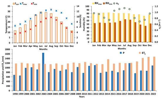Above: monthly averages of maximum and minimum air temperatures (Tmax and Tmin; °C), maximum and minimum relative humidity (RHmax and RHmin; %), number of sunshine hours (Isun; h), and wind speed at a 2 m height (u2; m s−1). Below: annual precipitation (mm) and annual grass reference evapotranspiration (ETo; mm); all data are for the period 1998–2022.