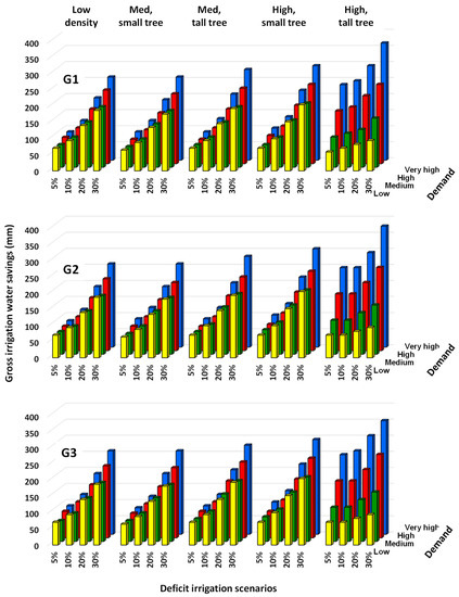 Gross irrigation water savings in G1 (clementine and mandarin), G2 (orange), and G3 (lemon and lime) under scenarios of different climate demand and deficit irrigation.