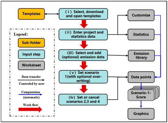 The calculation tool was SECTOR (Version 2): a Microsoft Excel-based tool released by IRRI in 2021 (https://ghgmitigation.irri.org/knowledge-products/mrv-toolbox/sector (accessed on 2 April 2023)). Its operation procedure is shown in Figure 1, and the relevant calculation parameters are listed in Table 1.