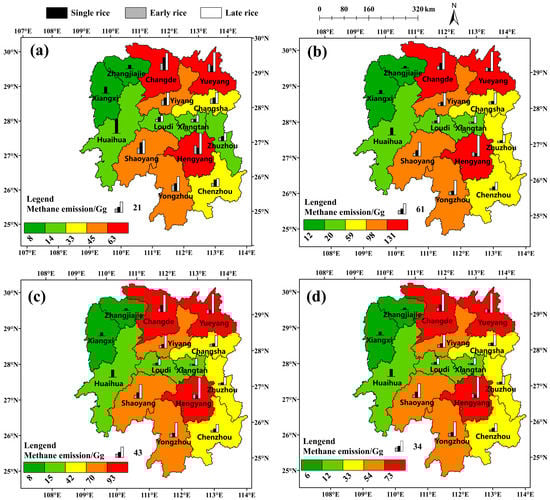 Figure 2. Methane emissions from rice fields in different cities in Hunan in 2019: (a) IPCC recommended value-methane emissions from flood irrigation; (b) Regional value-methane emissions from flood irrigation; (c) Regional value-methane emissions from mid-season drainage; (d) Regional value-methane emissions from AWD irrigation.