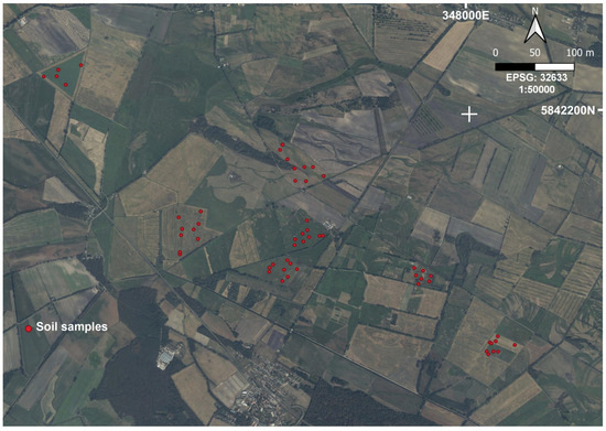 The main type of wetland in the study area is peatland, with an average groundwater level of up to 0.3 m depth, a mean annual temperature of 9.5 °C, and a mean annual precipitation of 550 mm. The landscape relief has an amplitude of 14 m, predominantly consisting of flat terrain, which further contributes to the formation of groundwater-dependent ecosystems. Additionally, the interaction between biomass, water table, and nutrient cycling in peatlands controls the formation of microrelief forms, resulting in significant heterogeneity in soil organic matter content. The most common soil groups in the study area, according to the World Reference Base soil classification [21], are Arenosols, Gleysols, and Histosols, all of which hold particular importance in peatland ecosystems. Arenosols are characterised by sandy textures and low organic matter content and can be found in transitional areas between mineral soil and peat deposits within peatlands. Gleysols exhibit gleyic properties, characterised by waterlogging and poor drainage due to restricted drainage conditions. In peatlands, Gleysols often occur in areas with high water tables, where water movement is hindered by peat accumulation or other factors such as topography. Histosols are organic soils with a high proportion of organic matter, primarily derived from partially decomposed plant material. In peatlands, Histosols are dominant and represent the organic-rich layers that constitute peat deposits.