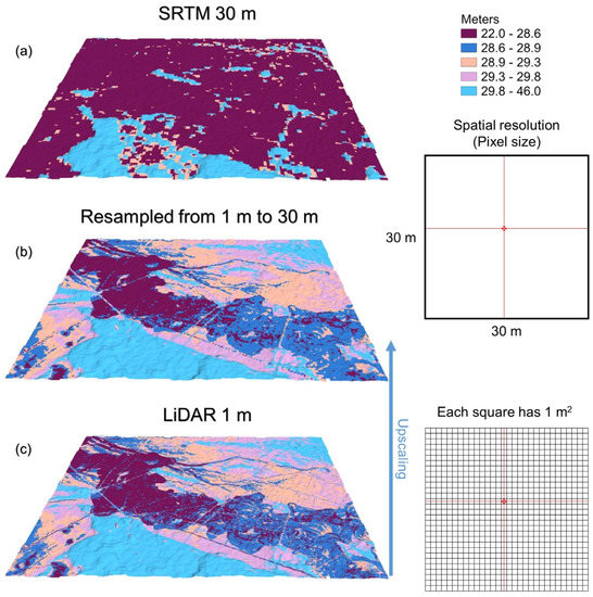 Digital elevation models from SRTM (a), LiDAR resampling procedure (b), and LiDAR (c) in the study area.