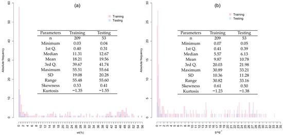Summary statistics of training and testing datasets of soil organic carbon (a) and total nitrogen (b).