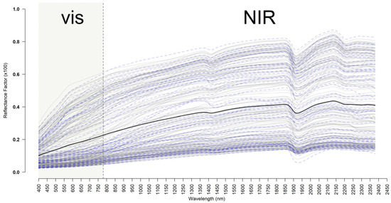 Spectral curves of the training (grey line) and testing (blue line) datasets in the visible (vis) and near-infrared (NIR) ranges. Black line represents the mean values of all spectral data.