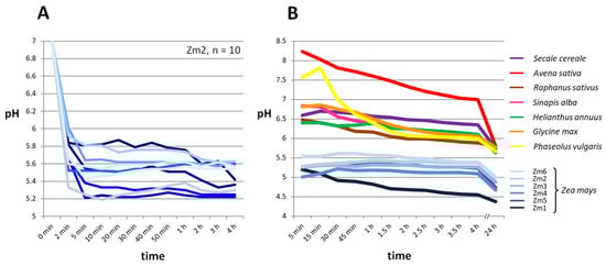 Maize grains rapidly acidify the medium after contact with water (Figure 1). Figure 1A illustrates the pH curves of ten individual maize grains in 4 mL deionised water, each over 4 h at 21 °C. The graph demonstrates that the initial acidification of the water occurs quite rapidly within the first two minutes of immersion, and the pH decreased by up to two units. There are differences in the magnitude of the effect between grains, but all samples initially lower the pH very rapidly and then stabilise over 4 h at pH values between 5.6 and 5.2. In Figure 1B, the pH effect of six different maize seed lots is shown in comparison with seeds of other crop plants of different families, other cereals included. In each case, 10 g of seed was incubated in 40 mL of deionised water, and the pH was monitored constantly over a period of 4 h and measured again after 24 h. In the first measurement, the pH of the water surrounding the maize samples dropped rapidly from an initial neutral pH of 7 to values between 5.5 and 5 after just 5 min, which is considerably lower than pH values of all other species tested within the same period. The soaking water of the other species (Secale cereale, Avena sativa, Raphanus sativus, Sinapis alba, Helianthus annuus, Glycine max, and Phaseolus vulgaris) showed a neutral pH between 6.5 and 7, while Avena sativa (pH 8.2) and Phaseolus vulgaris (pH 7.5) even raised the pH to slightly alkaline values. During the following 4 h, the pH of the Zea mays grains remained relatively stable, except for one seed lot (Zm1) that dropped to a pH of 4.5. The pH values of the other tested species decreased slightly during this time but did not fall significantly below pH 6. After 24 h of incubation, the pH of all samples dropped uniformly by approximately 0.4 pH units, except for Avena sativa, whose previous alkaline pH (after 4 h) dropped by 1.2 units. The Zea mays samples finally ended up with a pH value between 4.4 and 5, while the soak water of all other species showed a pH of about 5.7 after a day of immersion.