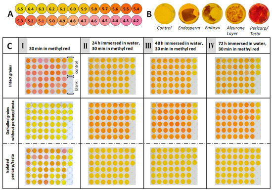 In a subsequent experiment, individual intact fruit (n = 126) was incubated in methyl red, and the pH effect was monitored over 72 h (3 d) (Figure 3C). This period covers all three stages of seed germination, from imbibition to radicle emergence [5]. In addition to whole grains being analysed, grains were separated from their pericarp/testa, and the dehulled seeds and pericarp/testa were incubated separately (Figure 3C) to assess the contribution of the different tissues to the acidification over time. To evaluate the colours of the pH indicator, we created a colour scale (Figure 3A), as described in Materials and Methods. On the first day, just after 30 min of incubation, the whole, intact grains change the colour of the indicator significantly, reaching pH values ranging from about 5.8 to about 4.4. Each grain had rapidly acidified the solution, but there are clear differences in acidification between the individual grains, which is consistent with the results shown in Figure 1A. In contrast, the dehulled grains without pericarp/testa only very slightly changed the pH indicator’s colour, indicating that no notable acidification had occurred. However, the isolated pericarp/testa of the same grains caused a significant change in colour of the indicator, although not as much as the intact grains. The individual pericarp/testa also differed significantly in terms of acidification. After 24 h submerged in water, the intact grains resulted in slight colour changes of the indicator (Figure 3CII), but compared to the first day’s result with dry grains (Figure 3CI), the colours appeared more uniform, and the acidification was less strong. The corresponding pH values were just below 6. The dehulled grains without pericarp/testa, which showed no effect in the first round of the experiment (Figure 3CI), now resulted in obvious colour changes of the pH indicator (Figure 3CII). Comparison with the colour scale indicated relatively uniform pH values of about 5.6. On the other hand, the corresponding manually removed pericarp/testae that resulted in a clear pH change after the first 30 min (Figure 3CI) now stopped changing colours, leaving the indicator as yellow as the control (Figure 3CII). When this protocol is repeated after 48 h under water, the results (Figure 3CIII) do not differ from those obtained after 24 h (Figure 3CII): Dehulled grains uniformly acidify the solution slightly, dehulled grains change the colour of the indicator slightly more, while wells with removed pericarp/testa alone remain yellow. This pattern remains unchanged after 72 h underwater (Figure 3CIV). At this time, the grains complete their germination by emerging visible radicles.