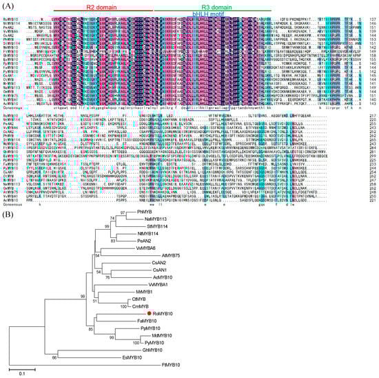 The ripe fruits of black raspberry were chosen to isolate the RoMYB10 gene due to their high anthocyanin contents. A 654 bp product was obtained using a pair of special primers. It encoded a predicted protein of 217 amino acids that had 100.0% similarity to the red raspberry RiMYB10 (ABX79950.1). So, the black raspberry clone was named the RoMYB10 gene. The calculated molecular mass of RoMYB10 protein was 25,341 Da, and the isoelectric point was 9.66. Alignment of the RoMYB10 protein with other MYBs indicated a high degree of homology in the R2R3 domain, especially some MYBs related to anthocyanin biosynthesis (Figure 1A) such as FaMYB10 from strawberry and PyMYB10 from Pyrus pyrifolia. RoMYB10 had 50% similarity to both FaMYB10 and PyMYB10. Moreover, in the R3 domain, all these MYB proteins contained the signature bHLH motif that is specific to the interaction between MYB and bHLH [38,39].