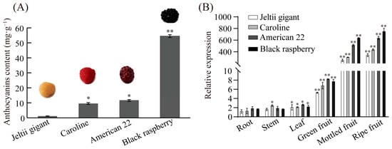 Relative expression of the RoMYB10 genes in four colored raspberry varieties and in different tissues of these raspberries. (A) Relative expression of the MYB10 genes in four varieties. (B) Relative expression of the MYB10 genes in different tissues and in fruits at different developmental stages in four varieties. Error bars indicate the mean ± SE of three replicate reactions. The asterisks above columns indicate significant differences (* p ≤ 0.05, ** p ≤ 0.01).