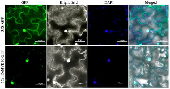 For the analysis of the subcellular localization of RoMYB10 protein, the coding sequence (CDS) of RoMYB10 was amplified by PCR and cut with BamHI/SalI and cloned into a pCAMBIA 2300 expression vector to generate a pCAMBIA 2300-35S::RoMYB10-GFP fusion expression vector. The fusion vector and the empty pCAMBIA 2300 vector were transformed into the Agrobacterium strain GV3101. Cells were grown overnight at 28 °C in a Luria–Bertani (LB) medium supplemented with 50 mg/L of kanamycin sulfate (Kana). After centrifugation, the collected cells were resuspended in the solution containing 10 mM MES pH 5.7, 10 mM MgCl2, 150 μM acetosyringone. Then, samples were incubated at room temperature for an additional one hour on a shaker. The bacteria were suspended in the fresh buffer and adjusted to a final density of OD600 = 0.8. Then, the suspensions were transformed into the abaxial side mesophyll cells of tobacco leaves using a needleless syringe. The treated plants were maintained in greenhouse conditions at 25 ± 1 °C with a 16 h/8 h light/dark cycle for 2–3 days before observation under a confocal microscope (Olympus FV1000) [34]. The staining of 4′, 6-diamidino-2-phenylindole (DAPI) was used as a nucleus marker.