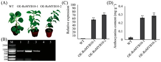 Ectopic expression of RoMYB10 gene in tobacco. (A) Comparison of phenotypes of wild-type (WT) and two RoMYB10 transgenic tobacco lines (OERoMYB10-1 and OERoMYB10-2). (B) Detection of RoMYB10 transcript levels in WT and transgenic tobacco lines visualized by semi-quantitative RT-PCR. Lane M: marker (Trans DNA 2K); Lane 1: 35S::OERoMYB10 line 1; Lane 2: 35S::OERoMYB10 line 2; Lane 3: positive control, plasmid of 35S::OERoMYB10; Lane 4: products of RT-PCR without template DNA; Lane 5: WT. (C) Relative expression levels of RoMYB10 in transgenic lines and WT were analyzed by qRT-PCR. The data were normalized using the WT sample and the NtActin (GQ339768) gene as the internal controls and calculated using the 2−ΔΔCT method. (D) Anthocyanin content of WT and transgenic lines. The asterisks above columns indicate significant differences compared to WT (** p ≤ 0.01).