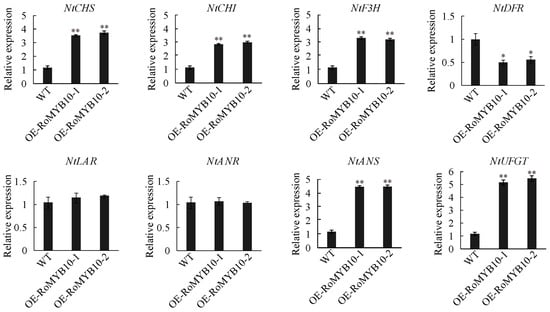 Relative expression of enzyme genes related to anthocyanin metabolism in transgenic tobacco lines and WT plants. The data were normalized using the WT sample and the NtActin (GQ339768) gene as the internal controls and calculated using the 2−ΔΔCT method. The asterisks above columns indicate significant differences compared to WT (* p ≤ 0.05, ** p ≤ 0.01).