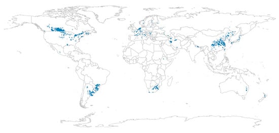 Countries where Gibberella zeae has been documented (blue dots). Modified from Del Ponte [8].