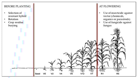 Interactions between Fusarium graminearum and corn are complex, and a great number of factors can contribute to the development of infection or resistance of the corn plant. Differences between cropping seasons seem to have a great impact on the damage caused by this disease [34,35]. Cropping methods are another important factor, but in this case, useful actions to control GER can be difficult to implement, due to economic sustainability, like a rotation, or on the contrary, environmentally sustainable methods like no tillage can increase the impact of this disease [28,89]. In the end, the use of insecticides to control the vector or fungicide to directly control the fungus may not be economically convenient and can cause the development of resistant populations [102,103,111]. The use of genetically modified organisms can be useful to control the vector, but they are not available everywhere [113,114]. Biological methods to control this fungus are still in development, and no commercial products are available [112].