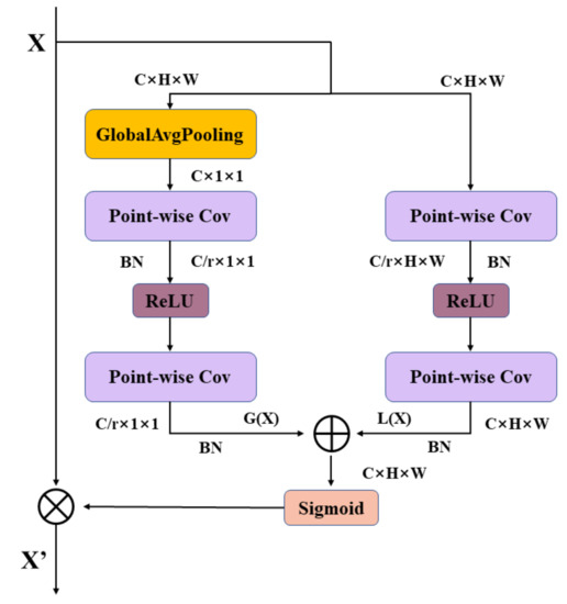 The MS-CAM structure is given in the Figure 8, it consists of two branches, the left of which is the global channel branch, and the global average pooling is used to make the acquired feature contain global information. The right branch is the local channel branch, and it is possible to calculate the local channel information from it. Finally, the MS-CAM module fuses the global channel information and the local channel information , and the output is generated after the attention operation on the input feature X is output by the weight value, as stated in Equation (2).