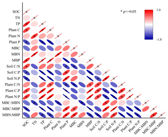 Soil C:N was significantly positively correlated with plant C:N, plant C:P and plant N:P and significantly negatively correlated with soil N:P and MBN:MBP. Soil C:P was significantly positively correlated with soil N:P, MBC:MBN and MBC:MBP. It was significantly positively correlated with plant C:P and plant N:P. Soil N:P was significantly positively correlated with MBC:MBP and MBN:MBP. It was significantly negatively correlated with plant C:P and plant N:P. Plant C:N was positively correlated with plant C:P and plant N:P, and it was negatively correlated with MBN:MBP (p < 0.05). Plant C:N was positively correlated with plant C:P and plant N:P, and it was negatively correlated with MBN:MBP. Plant C:P was positively correlated with plant N:P, and it was negatively correlated with MBC:MBP and MBN:MBP. Plant C:P was positively correlated with plant N:P, and it was negatively correlated with MBC:MBP and MBN:MBP. Plant N:P was negatively correlated with MBC:MBP and MBN:MBP. There was a significant positive correlation between MBC:MBP and MBN:MBP.