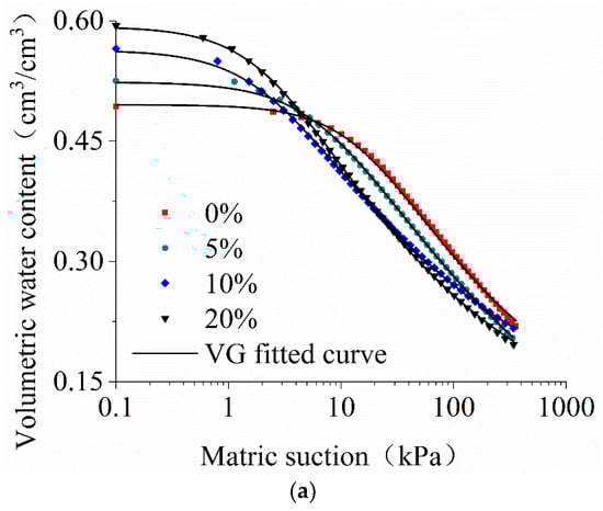 The evaporation was carried out under relatively constant temperature and humidity conditions in the laboratory. During the experiment, the readings from the upper and lower tensiometer, as well as the water loss changes of the soil samples, were automatically collected in real-time by the wireless data logger and the electronic balance, respectively. The soil suction was measured by the two tensiometers, and the water content was obtained from the water loss of the soil samples during the experiments. The average suction value of the two tensiometer readings was considered to form the SWRC, and the measured SWRC was fitted using the Van Genuchten (VG) model [46] (see Equation (2)). The unsaturated permeability function of the BAS was obtained following Equations (3) and (4) [43].