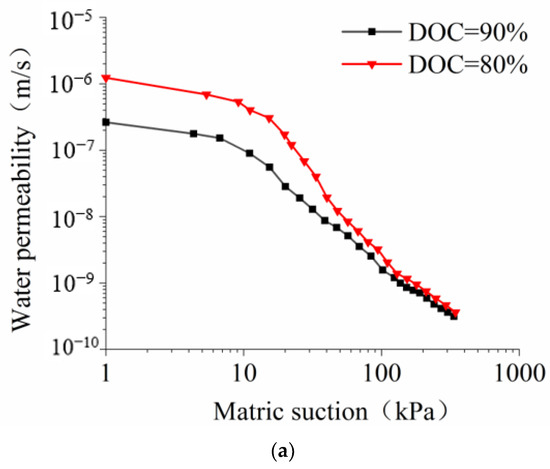 Effects of degree of compaction (DOC) on the unsaturated water permeability of BAS (10% biochar content) at biochar particle size: (a) CDG; (b) >2 mm; (c) 1–2 mm; (d) 0.25–1 mm; (e) <0.25 mm.