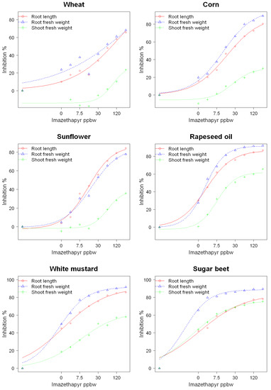 Wheat was the least sensitive crop, with a root growth inhibition of 11.1–65.96% and 22.53–73.99% for root length and root fresh weight, respectively (with no significant inhibition at concentrations below 30 ppbw). Inhibition of shoot fresh weight was observed at imazethapyr concentrations >30 ppbw but in a very narrow range (0.8–26.15%). These results are consistent with those of Moyer and Esau [58] and with the fact that no apparent injuries occurred in wheat sown one year after imazethapyr application [66,68,69]. Wheat could be classified as moderately sensitive to imazethapyr.